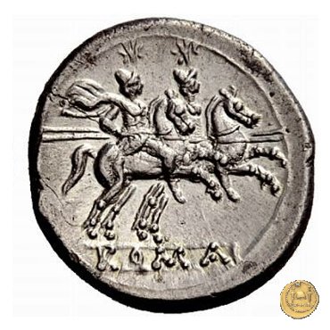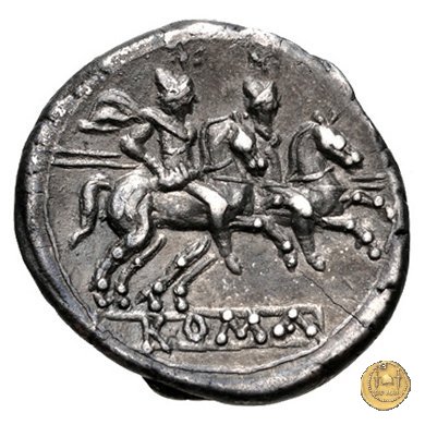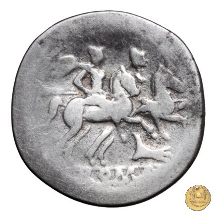 I Dioscuri a cavallo verso destra, con lancia in resta; due stelle sopra i loro pilei. Sotto un rostro di nave (rostrum tridens).
