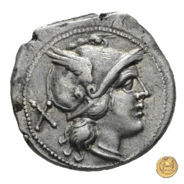 al R/ senza il rostro di nave. Seguendo il lavoro di Pierluigi Debernardi "Cr. 44 e le origini del denario" pubblicato su Panorama Numismatico n. 264 di luglio-agosto 2011, per un'identità stilistica questo denario anonimo (del gruppo 6) farebbero parte dell'emissioni con simbolo il rostro di nave. Per una migliore comprensione delle varie differenze stilistiche dei gruppi si rimanda al predetto articolo, nonchè al denario Cr. 44/5 - scheda R-A1/1 |