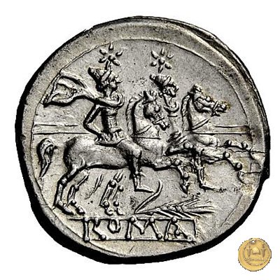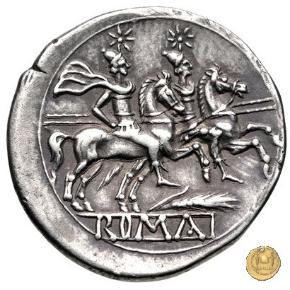 I Dioscuri a cavallo verso destra, con lancia in resta; due stelle sopra i loro pilei. Sotto una spiga di grano.