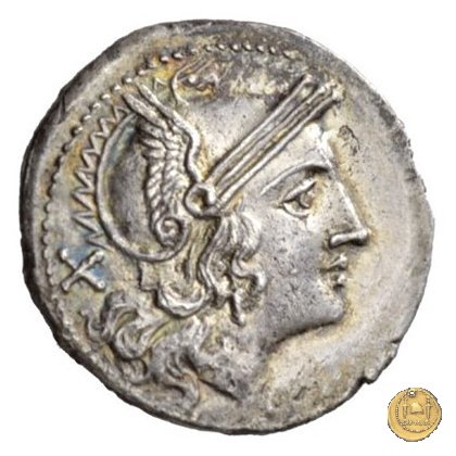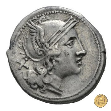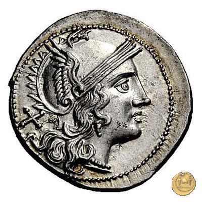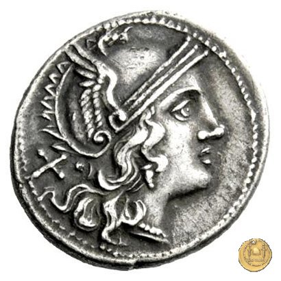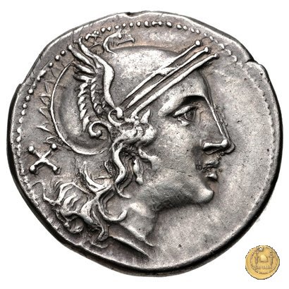Testa di Roma a destra, con elmo attico alato. Dietro: