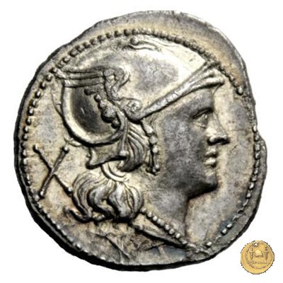Testa di Roma a destra, con elmo attico alato. Dietro: