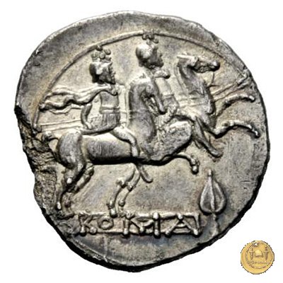 I Dioscuri a cavallo verso destra, con lancia in resta; due stelle sopra i loro pilei. Sotto una punta di lancia.