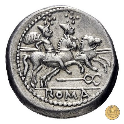 I Dioscuri a cavallo verso destra, con lancia in resta; due stelle sopra i loro pilei. Sotto un caduceo.