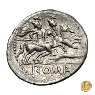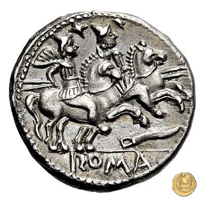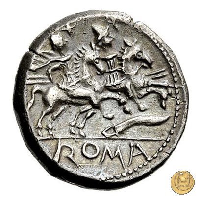 I Dioscuri a cavallo verso destra, con lancia in resta; due stelle sopra i loro pilei. Sotto un coltello.