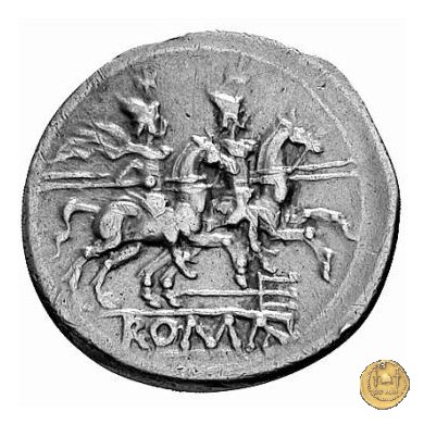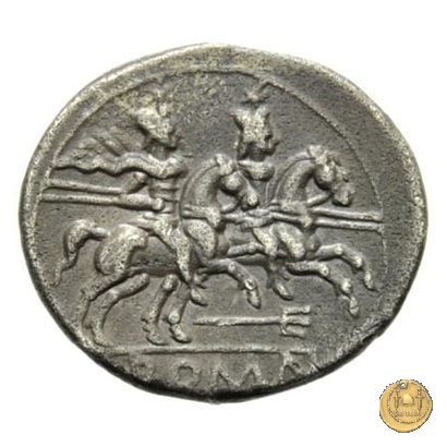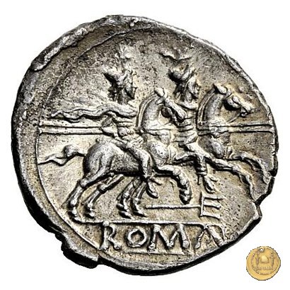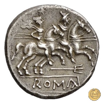I Dioscuri a cavallo verso destra, con lancia in resta; due stelle sopra i loro pilei. Sotto un tridente.