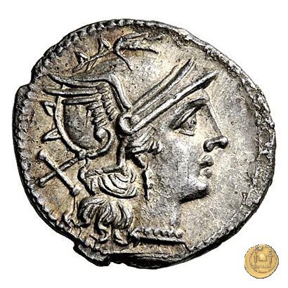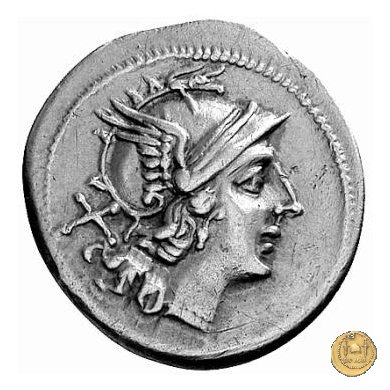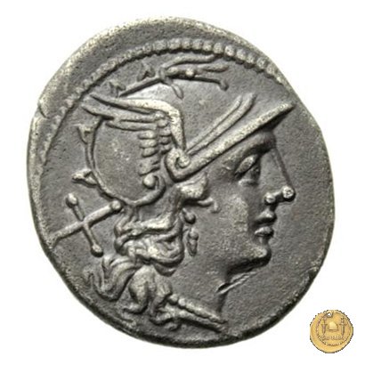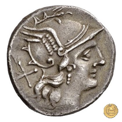 Testa di Roma a destra, con elmo attico alato. Dietro: