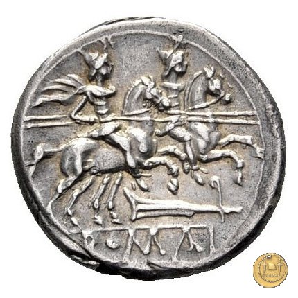 I Dioscuri a cavallo verso destra, con lancia in resta; due stelle sopra i loro pilei. Sotto un timone.