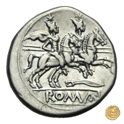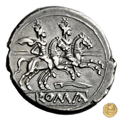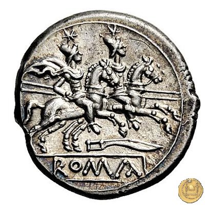 I Dioscuri a cavallo verso destra, con lancia in resta; due stelle sopra i loro pilei. Sotto un coltello.