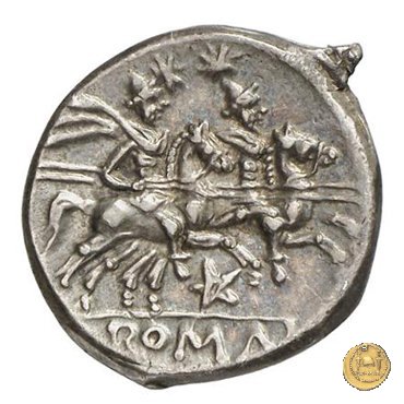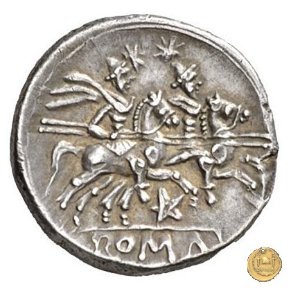 I Dioscuri a cavallo verso destra, con lancia in resta; due stelle sopra i loro pilei. Sotto un pentagramma.