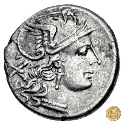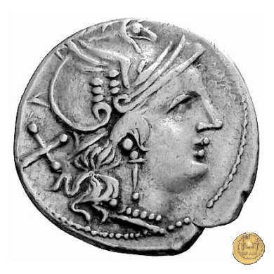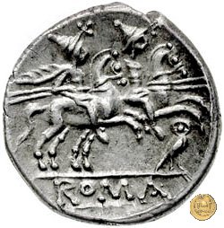 Testa di Roma a destra, con elmo attico alato. Dietro: