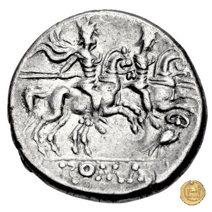 I Dioscuri a cavallo verso destra, con lancia in resta; due stelle sopra i loro pilei. Sotto una civetta.