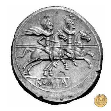 I Dioscuri a cavallo verso destra, con lancia in resta; due stelle sopra i loro pilei.