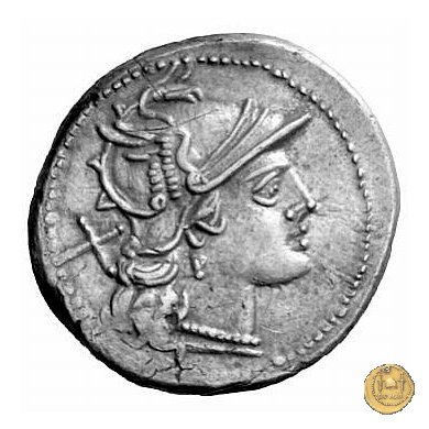 Testa di Roma a destra, con elmo attico alato. Dietro: