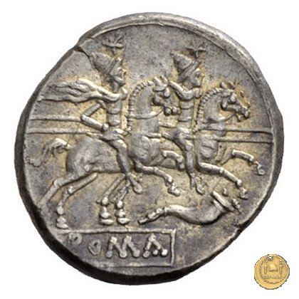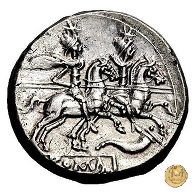 I Dioscuri a cavallo verso destra, con lancia in resta; due stelle sopra i loro pilei. Sotto una cornucopia.