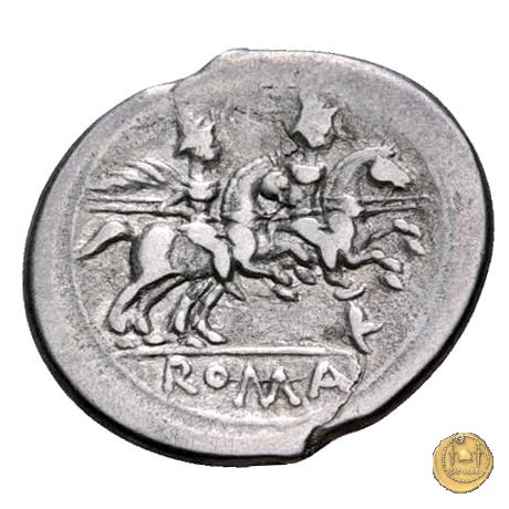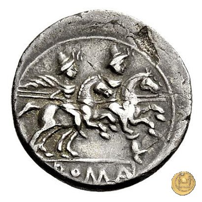 I Dioscuri a cavallo verso destra, con lancia in resta; due stelle sopra i loro pilei. Sotto un elmo.