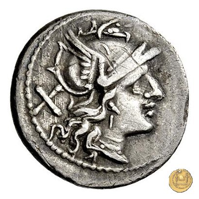 Testa di Roma a destra, con elmo attico alato. Dietro: