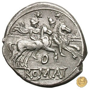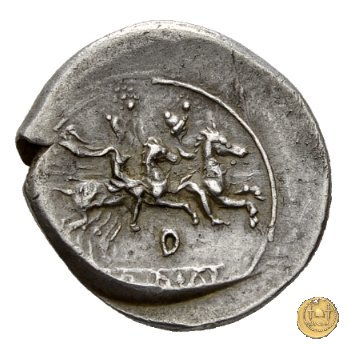 I Dioscuri a cavallo verso destra, con lancia in resta; due stelle sopra i loro pilei. Sotto: D