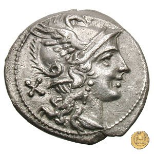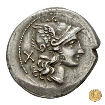 Testa di Roma a destra, con elmo attico alato. Dietro: