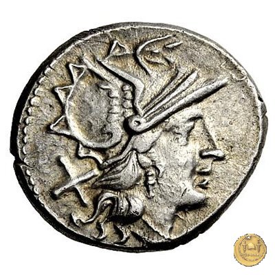 Testa di Roma a destra, con elmo attico alato. Dietro: