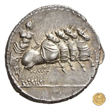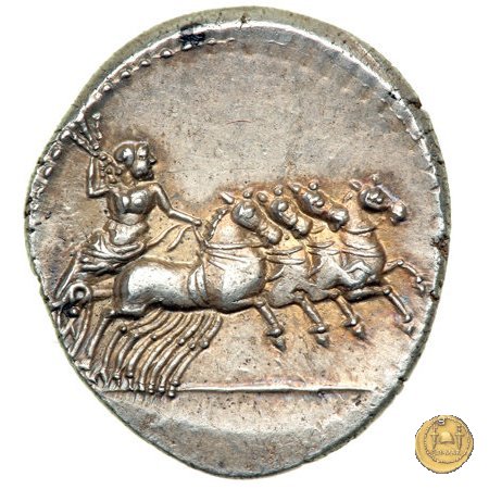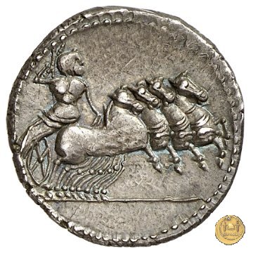 Giove su quadriga verso destra; tiene le redini con la mano sinistra e sta per scagliare il fulmine con la destra.