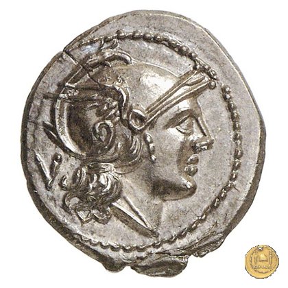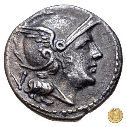 Testa di Roma a destra, con elmo attico alato. Dietro: V