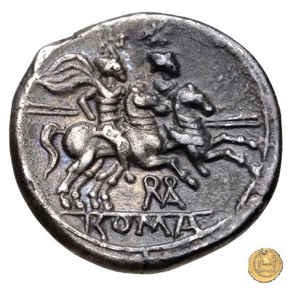 I Dioscuri a cavallo verso destra, con lancia in resta; due stelle sopra i loro pilei. Sotto: