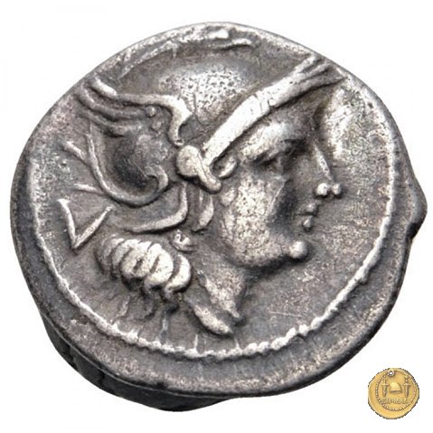 Testa di Roma a destra, con elmo attico alato. Dietro: V