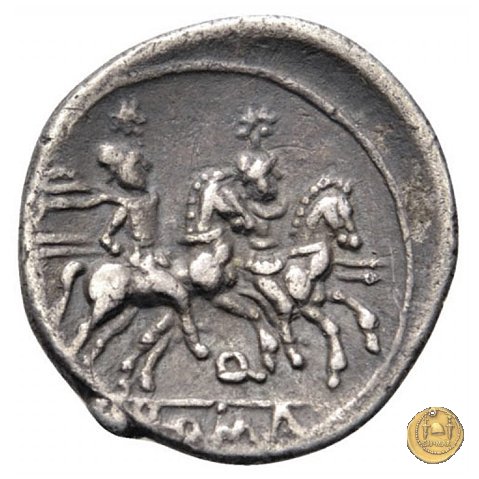 I Dioscuri a cavallo verso destra, con lancia in resta; due stelle sopra i loro pilei. Sotto: Q