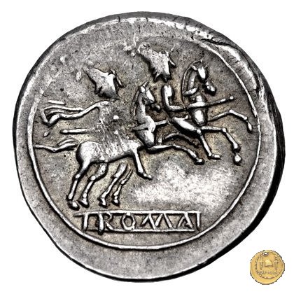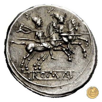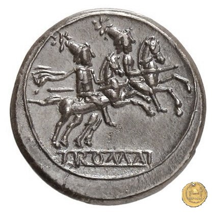 I Dioscuri a cavallo verso destra, con lancia in resta; due stelle sopra i loro pilei.