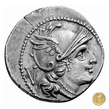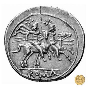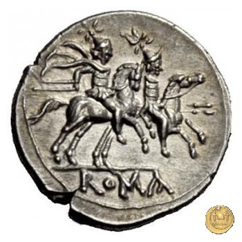 Testa di Roma a destra, con elmo attico alato. Dietro: V I Dioscuri a cavallo verso destra, con lancia in resta; due stelle sopra i loro pilei.