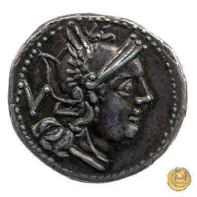 Testa di Roma a destra, con elmo attico alato. Dietro: V