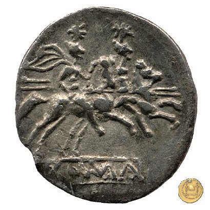 I Dioscuri a cavallo verso destra, con lancia in resta; due stelle sopra i loro pilei.