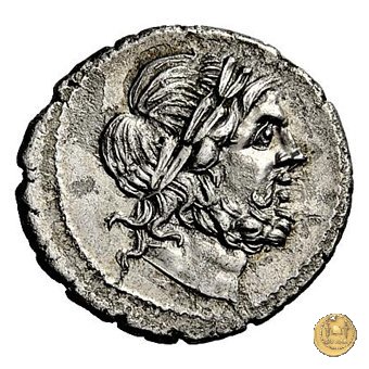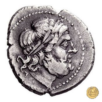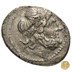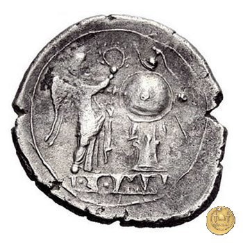 Testa laureata di Giove a destra. La Vittoria stante a destra, incorona un trofeo d'armi.