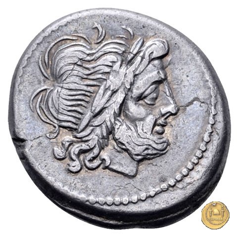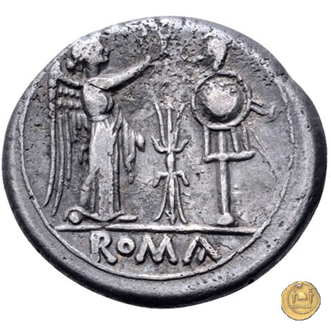 Testa laureata di Giove a destra. La Vittoria stante a destra, incorona un trofeo d'armi. Al centro un fulmine.