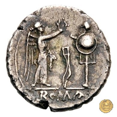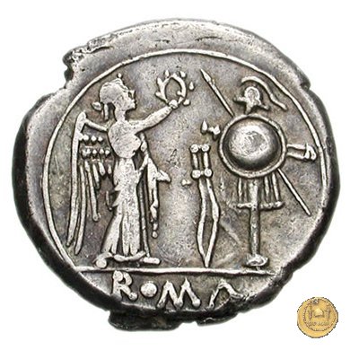 La Vittoria stante a destra, incorona un trofeo d'armi. Al centro un coltello.
