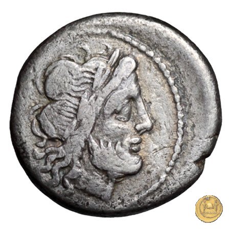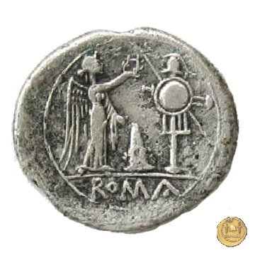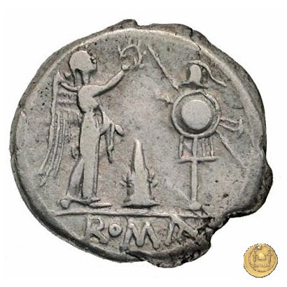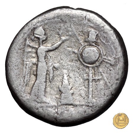 La Vittoria stante a destra, incorona un trofeo d'armi. Al centro una meta.