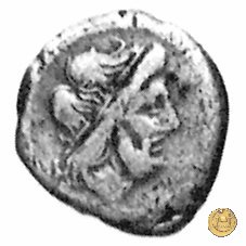 Testa laureata di Giove a destra.