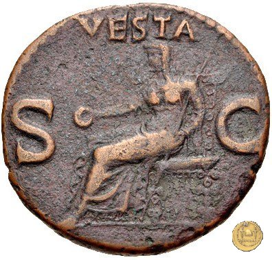Vesta, velata e drappeggiata, seduta verso sinistra su di un trono. Nella mano destra tiene una patera, nella sinistra uno scettro.