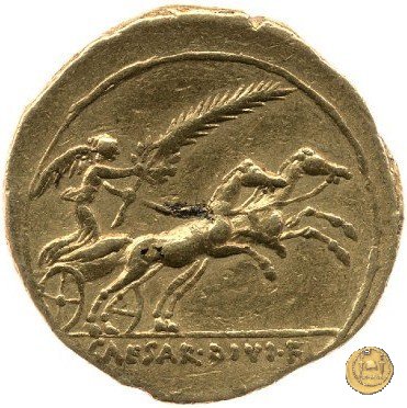 Una Vittoria, drappeggiata, al comando di una biga rivolta verso destra. Con la mano sinistra tiene le briglie e una palma e con la destra, una ghirlanda.