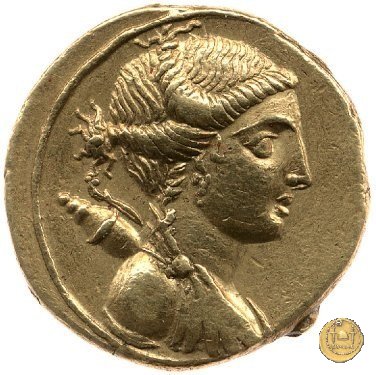 Busto di Diana, drappeggiata e con arco e faretra sulla spalla, rivolto verso destra.
