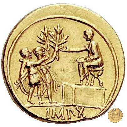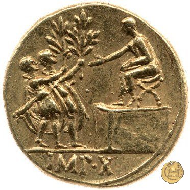 Due soldati con parazonium che donano ad Augusto, che è seduto su uno sgabello su una piattaforma, rivolto verso sinistra, due rami.