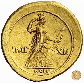 Diana, drappeggiata e con copricapo a polos, che avanza verso destra, intenta a prendere una freccia con la mano destra; nella sinistra, tiene l'arco.