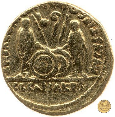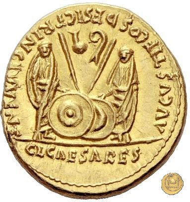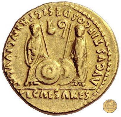 Caio Cesare e Lucio Cesare, in piedi e togati, tengono ognuno una mano su di uno scudo davanti a loro; dietro ogni scudo c'è una lancia; sopra di loro, a sinistra, un simpulum rivolto verso destra e a destra un lituus rivolto verso sinistra.