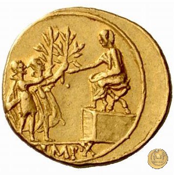 Due soldati con parazonium che donano ad Augusto, che è seduto su uno sgabello su una piattaforma, rivolto verso sinistra, due rami.