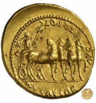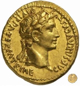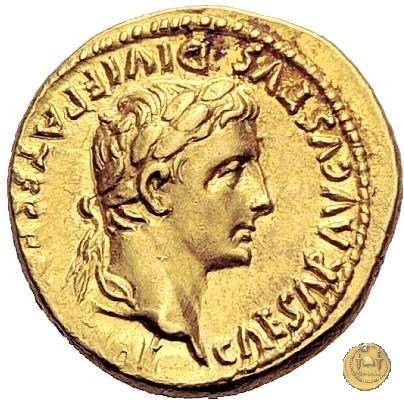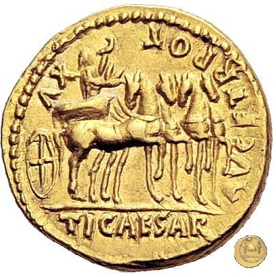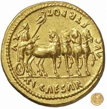 Tiberio, laureato e in piedi verso destra su una quadriga trionfale. Nella mano destra tiene una ghirlanda e nella sinistra uno scettro con testa ad aquila. Le teste del primo e del terzo cavallo sono rivolte verso sinistra.