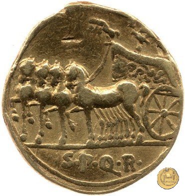 Una quadriga rivolta verso sinistra con il carro decorato e contenente un'aquila e una miniatura di quattro cavalli al galoppo. I cavalli della quadriga hanno tutti la testa rivolta verso sinistra.