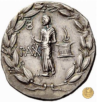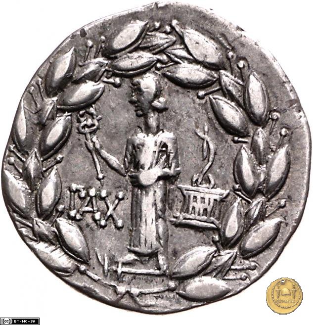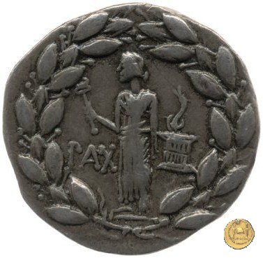 La Pax, drappeggiata e rivolta verso sinistra; nella mano destra tiene un caduceo. Nel campo, a destra, una cista mistica dalla quale esce un serpente. Tutta la scena è contornata da una ghirlanda.