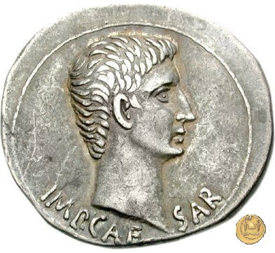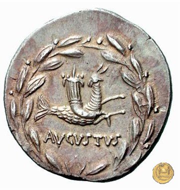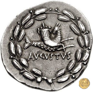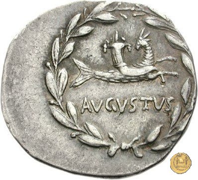 Testa di Augusto rivolta verso destra. Un capricorno, con la testa rivolta verso sinistra e una cornucopia sulla schiena. Tutta la scena è contenuta in una ghirlanda.