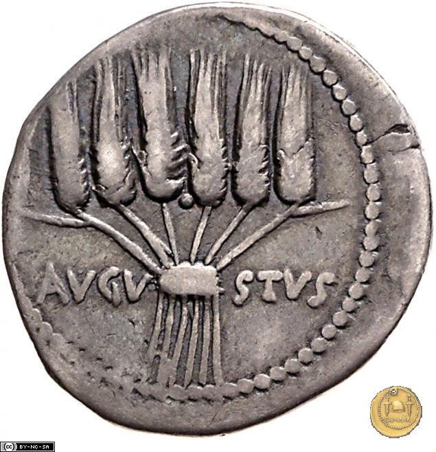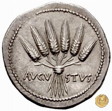 Testa di Augusto rivolta verso destra. Sei spighe di grano con i gambi intrecciati. Contorno perlinato.