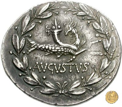 Un capricorno, con la testa rivolta verso sinistra e una cornucopia sulla schiena. Tutta la scena è contenuta in una ghirlanda.
